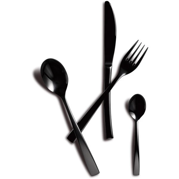 Fyra stycken knivar, skedar, gafflar och kaffeskedar i vackert och tÄligt stÄl. Eleganta bestick med en djupa svarta fÀrg. Moderna bestick i en tidlös och elegant design. Serien Passion Àr en modern romantiker!
