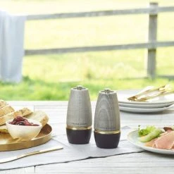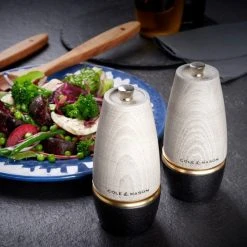Wood-serien har en stilren design med klassiska former. Basen i gjutjÀrn ger en betryggande tyngd och en kÀnsla av kvalitet. Detta Àr en precisionssaltkvarn tillverkad av mÄlad bok med en bas av gjutjÀrn och band av guldstÄl.