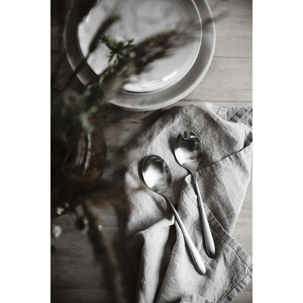 Stilren form som låter funktionen bli en del av designen. Formgivna av Ernst Kirchsteiger som är mycket omtyckt för sin stilrena skandinaviska design. Det borstade stålet lyfter bordsdukningen och gör den lite vackrare. Praktiskt formade, där det ena besticket liknar en gaffel. Ypperliga som salladsbestick.