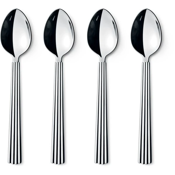 Rör ner socker i teet eller kaffet men dessa eleganta teskedar frĂ„n Georg Jennsens klassiska Bernadotte-kollektion. Kollektionen Ă€r, som namnet antyder, designad av Sigvard Bernadotte som var greve av Wisborg. Bernadotte föddes till prins av Sverige med blev efter giftermĂ„l med en icke-kunglig kvinna frĂ„ntagen titeln. Romantiken i denna historia Ă„terspeglas i de vackra skedarna och den klassiska utstrĂ„lningen gör sig otroligt bra pĂ„ bordet. I setet finns fyra teskedar i blankt rostfritt stĂ„l som tĂ„l maskindisk.Â