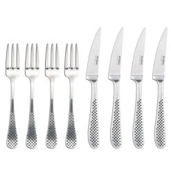Elegant och stilrent bestickset frĂ„n Global innehĂ„llande 4 stekknivar och 4 gafflar. Besticken Ă€r tillverkade i rostfritt stĂ„l av hög kvalitet. BĂ„de knivar och gafflar kĂ€nnetecknas genom ”Global-prickarna” pĂ„ skaften och designen Ă€r dessutom ergonomiskt utformade som gör att besticken ligger bekvĂ€mt i handen. Setet innehĂ„ller knivar och gafflar för fyra personer, totalt 8 delar.