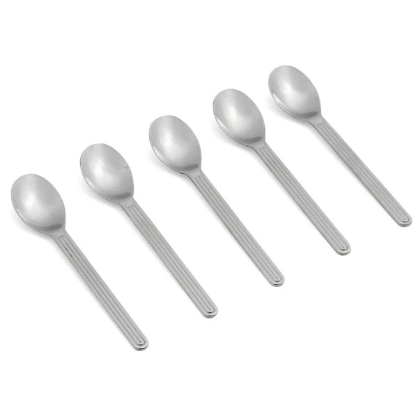Set om fem stilrena matskedar från serien Sunday, formgivna av designstudion BIG-GAME för danska HAY. Serien kännetecknas främst av sin raka form och det karaktäristiska räfflade handtaget – perfekt för att skapa vackra dukningar både till fest och till vardags. Utöver matskedarna inkluderar serien även gafflar, matknivar, serveringsskedar, latteskedar och teskedar.