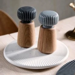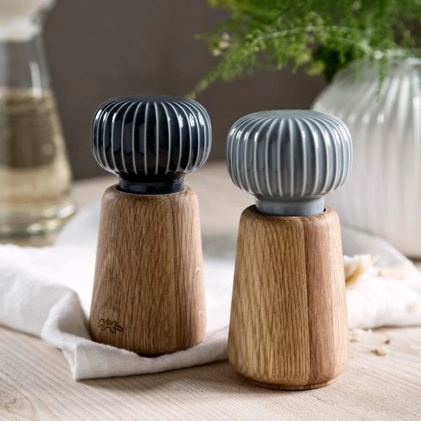 Denna salt-/pepparkvarn från Kählers Hammershøi-servis är ett spännande möte mellan de eleganta nordiska materialen keramik och trä. Kvarnen är dekorerad med en fin knopp, som förutom att vara en vacker detalj också har en funktionell fördel. De vackra räfflorna gör att kvarnen är lätt att använda och fylla med kryddor. Ett tips är att använda olika färger på kvarnarna, så att du kan se skillnad på din salt- och pepparkvarn.