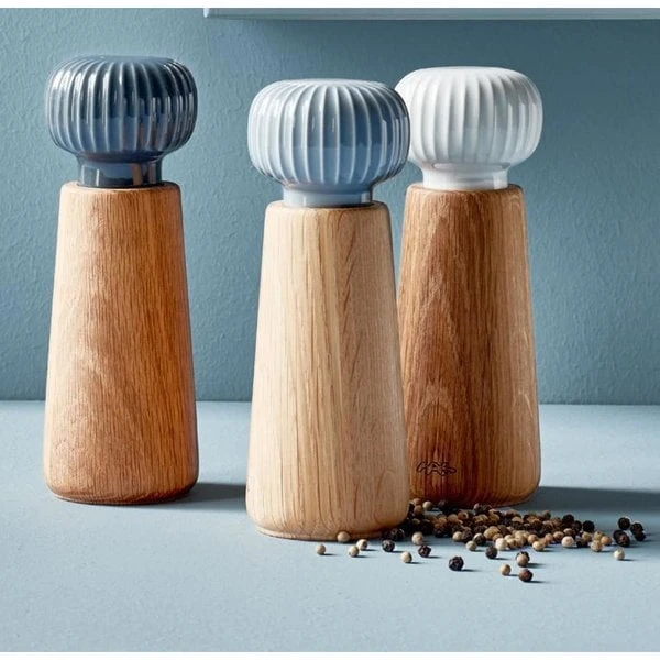 Denna salt-/pepparkvarn från Kählers Hammershøi-servis är ett spännande möte mellan de eleganta nordiska materialen keramik och trä. Kvarnen är dekorerad med en fin knopp, som förutom att vara en vacker detalj också har en funktionell fördel. De vackra räfflorna gör att kvarnen är lätt att använda och fylla med kryddor. Ett tips är att använda olika färger på kvarnarna, så att du kan se skillnad på din salt- och pepparkvarn.
