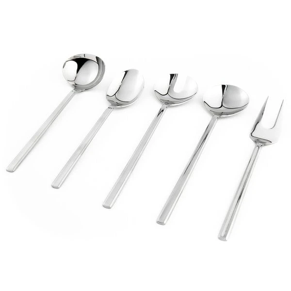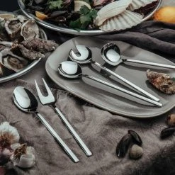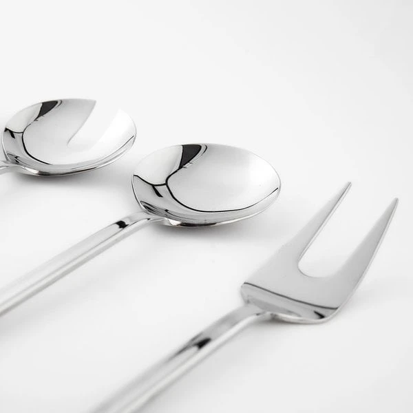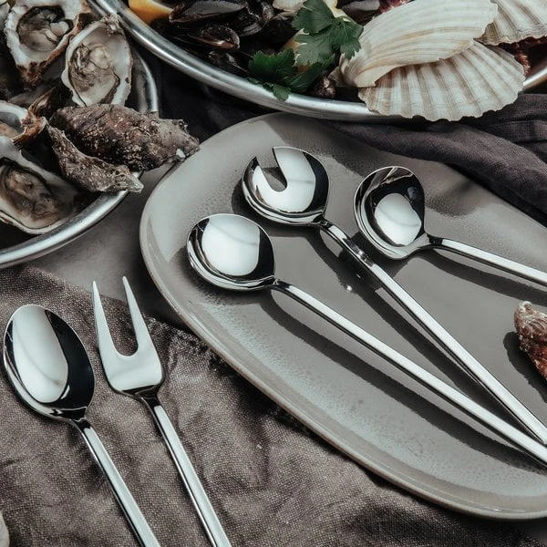 Stilrena serveringsbestick från Mareld, förgyller såväl vardag som festdukningen. Besticken håller hög kvalitet och är tillverkade av 18/10 rostfritt stål (innehåller 18 % krom och 10 % nickel) med blank finish. Setet innehåller 5 delar; en salladssked och en salladsgaffel, en serveringssked (perfekt till servering av exempelvis potatis), en serveringsgaffel (perfekt till servering av exempelvis kött) och en sås/soppslev. Besticken tål maskindisk. Matcha snyggt och komplettera med övriga bestickset från Mareld. Besticken levereras i fin presentförpackning tillverkad av FSC-certifierad kartong.