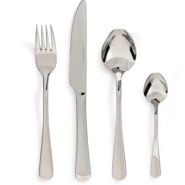 Ett vackert och noga utvalt bestickset frÄn Markus Aujalay som ger en eleganta klass till matbordet. Besticken Àr tillverkade av hög kvalitets stÄl med en spegelblank finish. De har en mjuk form och Àr mycket behagliga att hÄlla i. Gaffeln, kniven och skeden Àr 4 mm. tjocka och teskeden 3 mm. tjock. Setet innehÄller 6 knivar, 6 gafflar, 6 skedar och 6 teskedar. De tÄl att rengöras i diskmaskin för enkel rengöring och levereras i en exklusiv presentlÄda.