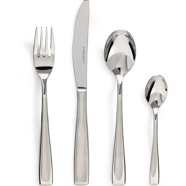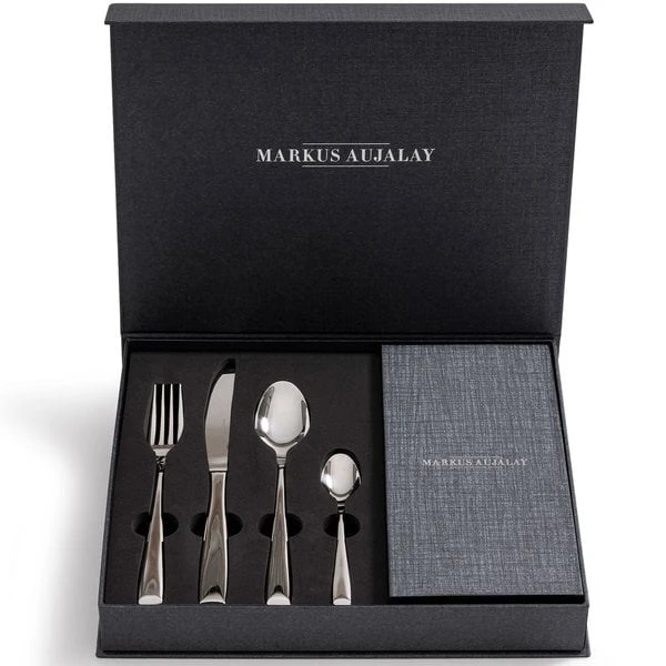 Detta vackra bestickset frÄn Markus Aujalay ger middagsbordet en perfekt balans mellan elegans och harmoni. Besticken Àr stora, men mjuka i formen och sköna att hÄlla i. De Àr tillverkade av hög kvalitets stÄl 18/10 med spegelblank yta. Gaffeln, kniven och skeden Àr hela 6 mm. tjocka och teskeden 5 mm. tjock. Setet innehÄller 6 gafflar, 6 knivar, 6 skedar och 6 teskedar. Alla delar Àr mÀrkta med Markus Aujalays logo. För enkel rengöring tÄl alla delar rengöring i diskmaskin. Besticksetet levereras i en exklusiv presentask.