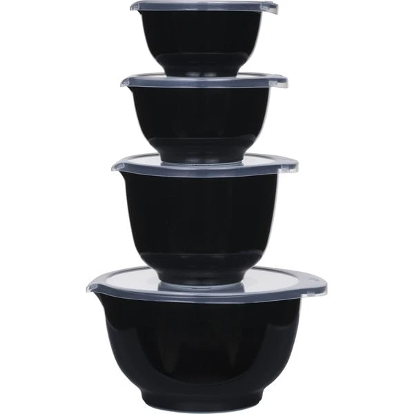 Det här stilrena setet, i svart, består av fyra mycket användbara storlekar på 0,5-, 0,75-, 1,5- samt 3,0 liter. Dessutom ingår fyra tillhörande lock. Margretheskålarna är lämpliga vid tillredning av mat, men kan naturligtvis även användas i andra sammanhang som till servering och förvaring.