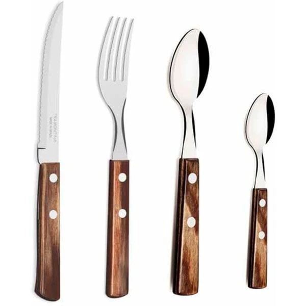 Duka för upp till 6 personer med detta fina bestickset frÄn Tramontinas Polywood-kollektion. Besticken Àr vÀrmebehandlade och sammansatta med aluminium, vilket gör dem extra slitstarka och hÄllbara. Besticken innehÄller 6 gafflar, knivar, mat- och teskedar, och samtliga 24 delar tÄl maskindisk.