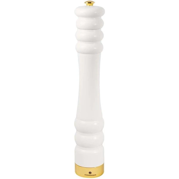 Kvarnen mÀter 35 cm och Àr tillverkad i vitlackerad bok med knopp och stÄlkant nertill i guld. En mycket elegant design som gör kvarnen till en vacker detalj pÄ köksbordet.