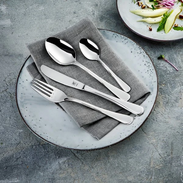 Ett klassiskt bestickset ur Zwillings serie Jessica. Setet innehÄller 24 delar: 6 gafflar, 6 knivar, 6 matskedar och 6 teskedar. Alla delar Àr tillverkade av glanspolerat rostfritt stÄl och tÄl diskmaskin.